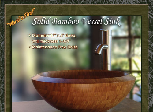 We offer beautifully designed inlay back splashes with cap pieces in either caramelized Flat Grain or Vertical Grain. This design is also available without the inlay, or as ¾" x 4" x 96" planks in caramelized Flat Grain or Vertical Grain that you can customize yourself as well as vessel sinks. Click below to see the sink offered.